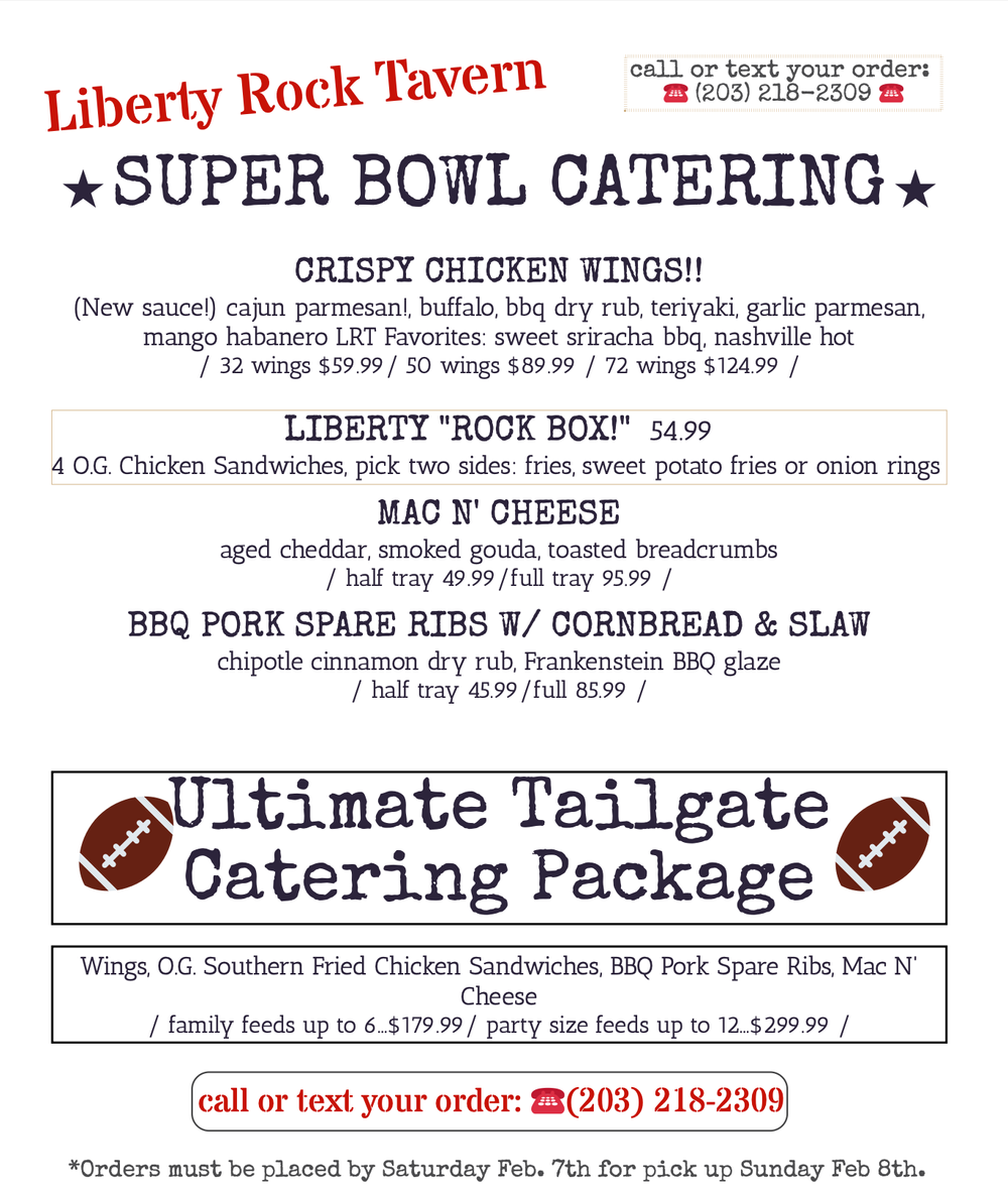 Liberty Rock Tavern and The Commissary by Liberty Rock in Shelton specializes in Game Day catering! Think: Wings! BBQ pork spare ribs! Smoked gouda mac n’ cheese, WINGS! Award-winning fried chicken sandwiches! Also – THE. BEST. WINGS. Crispy on the outside, tender and juicy on the inside, and sauced to perfection, with ten delicious flavors to choose from including their new Cajun parmesan, Nashville Hot, mango habanero and sweet sriracha BBQ (their favorite!). Pro Tip: Order one of their Super Bowl packages – it’s the best bang for your buck. The Family Package feeds 6-8 and includes smoked gouda mac n’ cheese, wings, southern fried chicken sandwiches, and BBQ pork spare ribs. The Party Package feeds 10-12 and includes the same choices, just more of it! To order, call or text 203.218.2309. Mention this ad and receive the exclusive CTBITES 10% discount! Orders must be in by Saturday, Feb. 7th for pick up on Sunday, Feb. 8th.