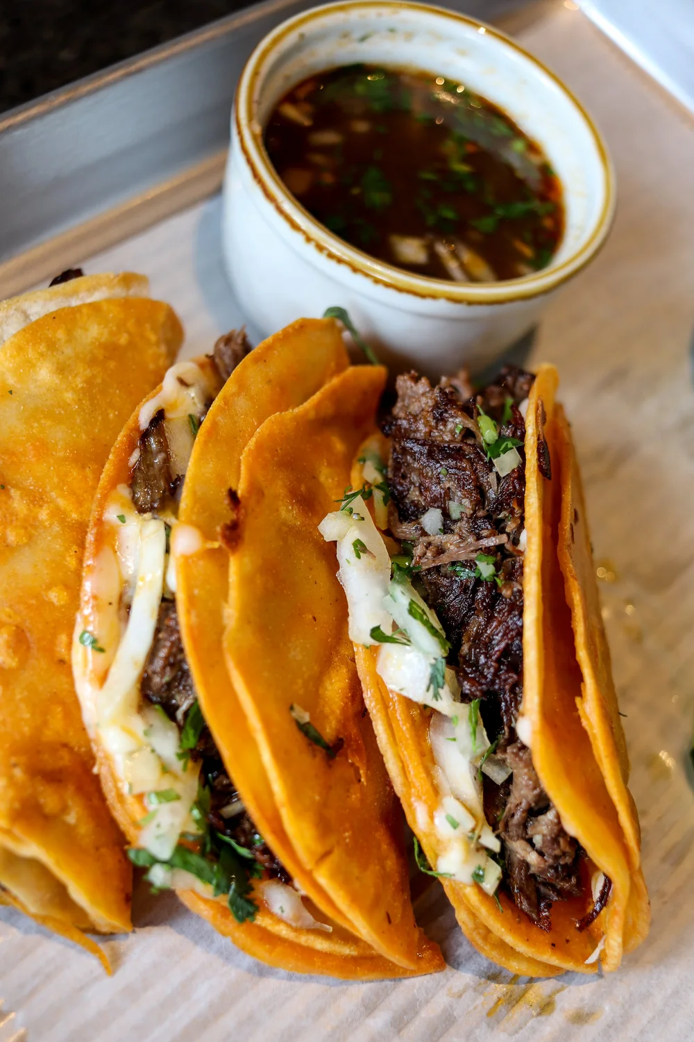 Tacos here are birria (pictured), grilled chicken, chorizo, grilled steak, carnitas, al pastor, costra (three cheeses with chorizo, steak, guac, and pineapple), and shrimp.