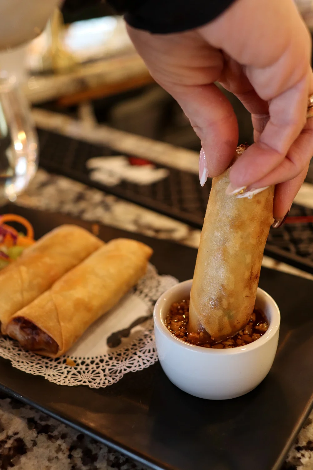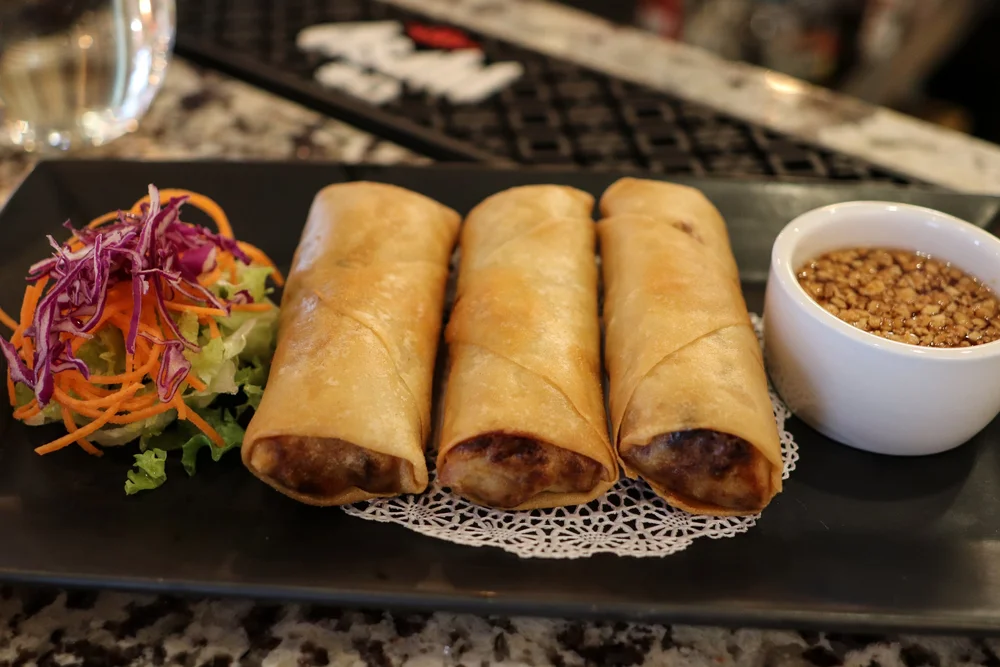 Starters range from these crispy pork spring rolls, to gyoza, lettuce wraps, coconut shrimp, and curry puffs.