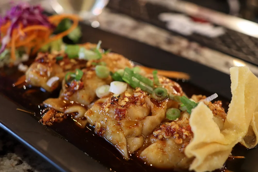 Chili oil dumplings if you like a little heat—FYI, all their sauces and this chili-garlic oil is homemade.