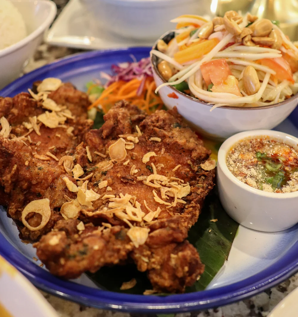 Hat Yai fried chicken is an often special is something Jarupan, Jirapan, and Pussawat brought back to Wilton from their travels back to Thailand. Chicken thighs are marinated in herbs, fried, and served with papaya salad, sticky rice, and a spicy vinegar based sauce.