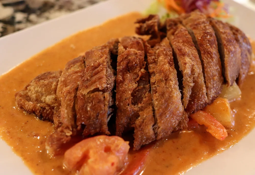You’ll spot this on a lot of tables, too—fried duck with red curry, pineapple, basil, red peppers, and tomatoes.
