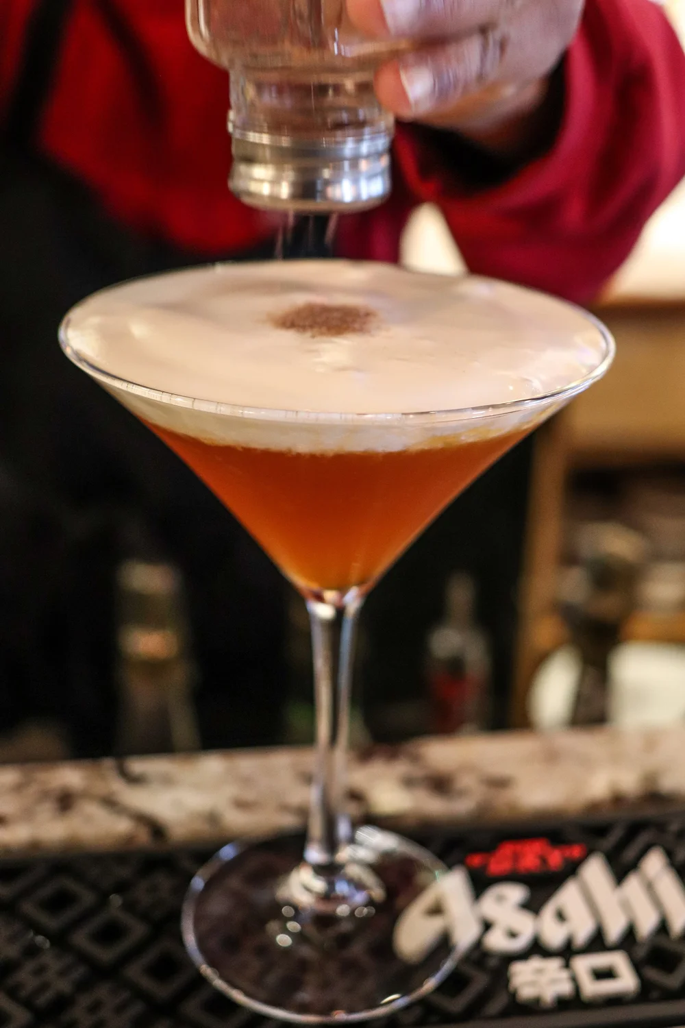 Thai iced tea martini with frothy whipped, sweetened milk on top