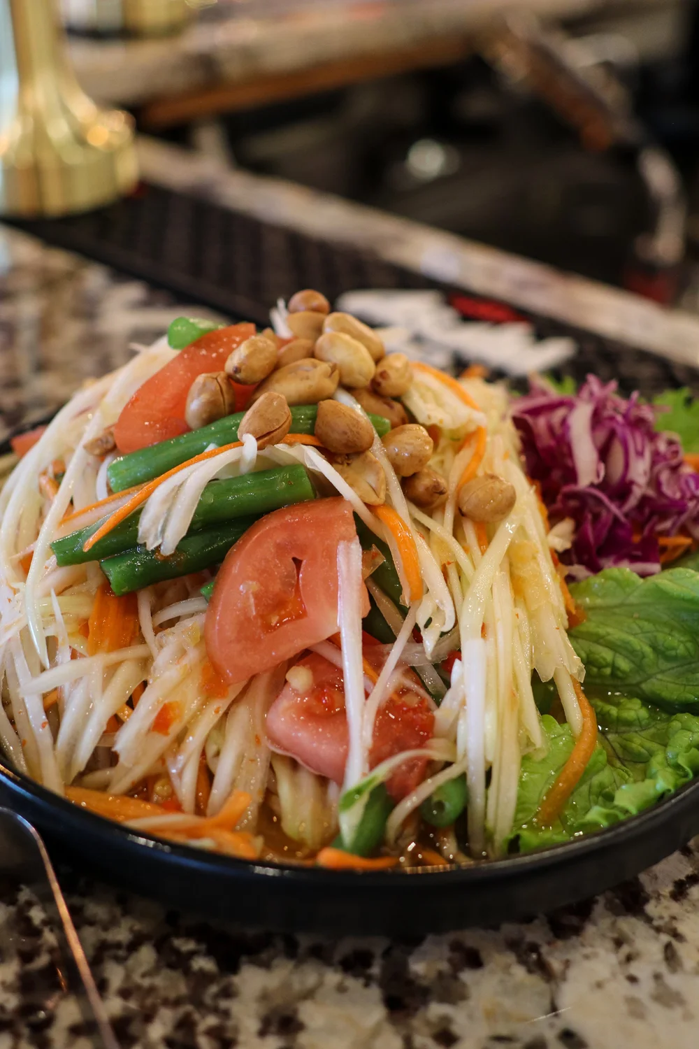 Green papaya salad – shredded unripe papaya, chili vinaigrette, tomatoes, carrots, green beans, and peanuts