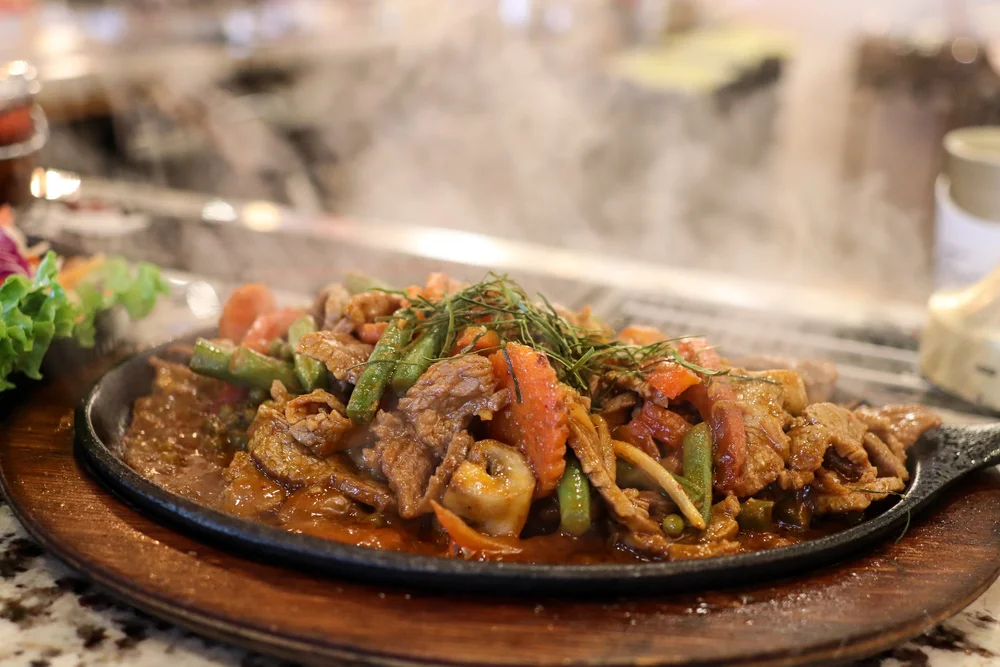 Entrée portions are generous here. Sizzling beef (also popular when they run it) comes out in a screaming hot cast iron skillet with strips of tender beef, Thai herbs, peppercorns, finger root, kaffir lime leaves, string beans, peppers, carrots, mushrooms, and a side of rice to soak up all that sauce.
