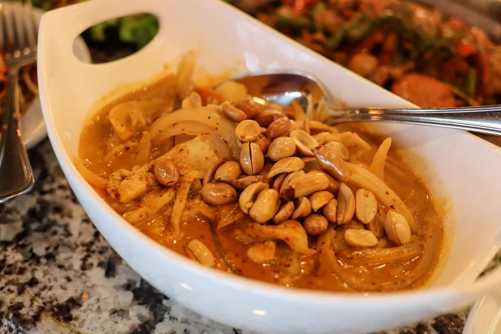 Curries at Bangkok Republic are popular and come in green, red, panang, massaman, or yellow (pictured with potatoes, onions, and chicken) and come with a side of rice.