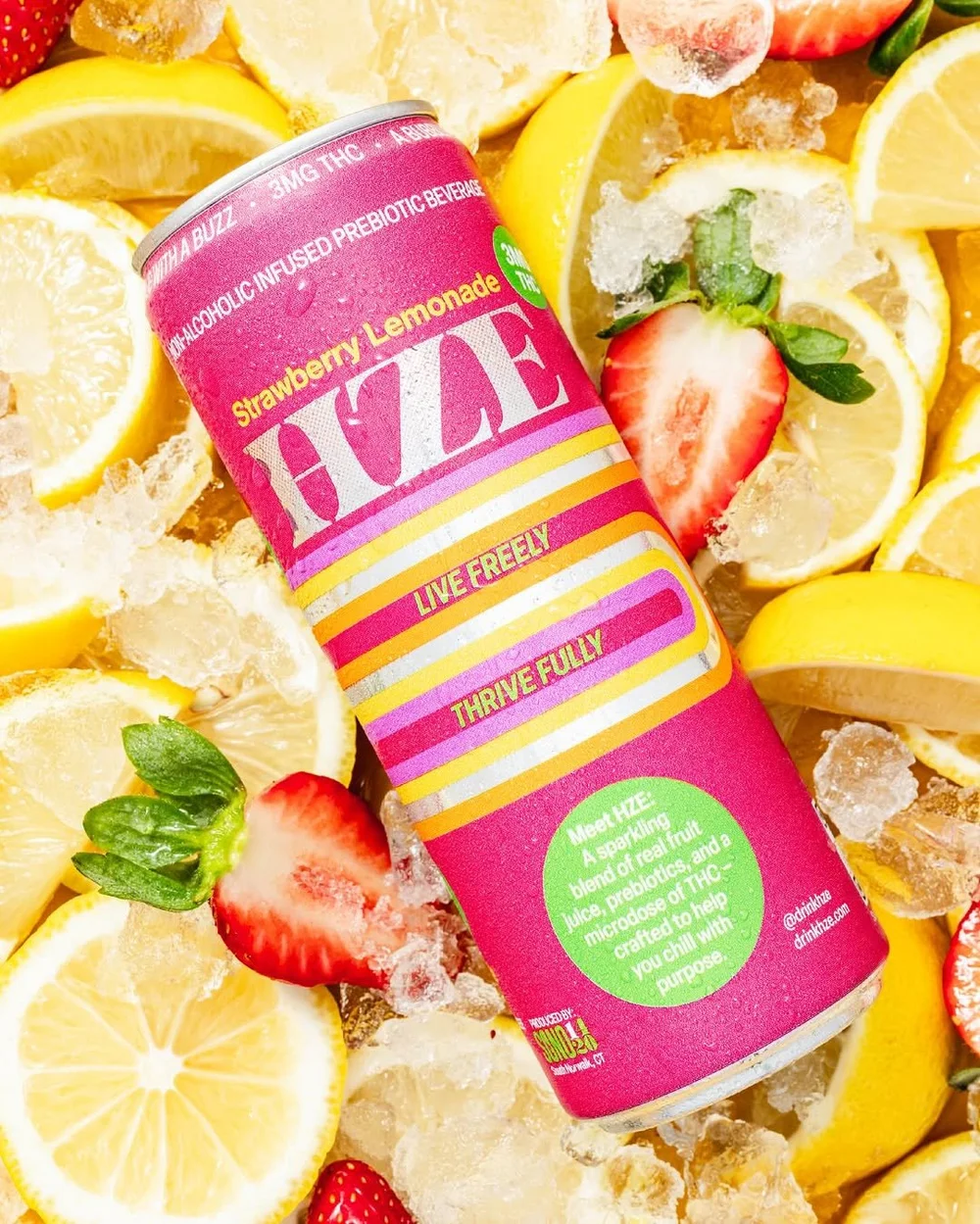 “It’s three milligrams, less than a good hit of a joint that might be 5-10 milligrams of THC,” he explains. “You might get the feeling like you drank a light beer, but similar to a healthier version of a soda, but it’s low sugar, and prebiotic. It’s to chill, but without the morning after hangover or if you want to cut down on alcohol, HZE is for that. It won’t get you fucked up, unless you drink 10 cans, but good luck drinking 10 cans of anything. You’ll probably drink it over an hour or two. It’ll mellow you out and help you sleep a bit. There’s no added sugar, so it’s true to our brand where everything we do it natural. In our RTD cocktails, we use real coffee, and in our strawberry lemonade with vodka, it’s all real juice. Unlike seltzers that have flavor essence, ours is real.”