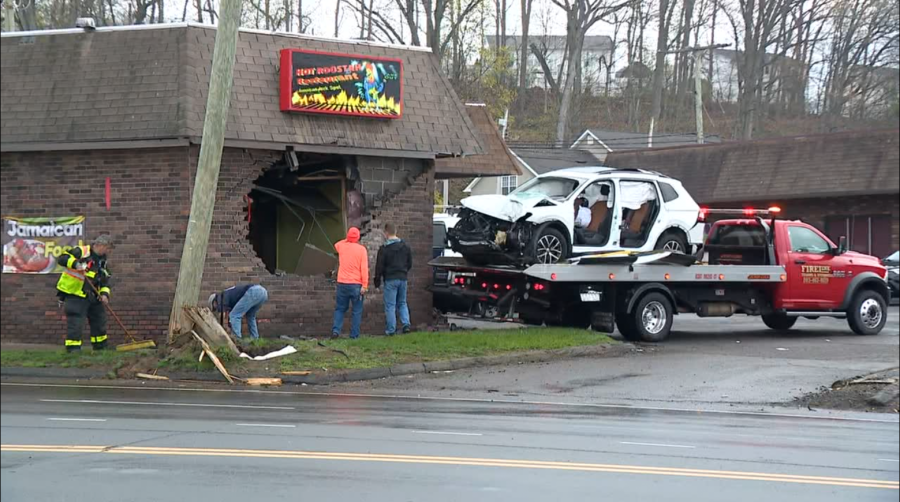 A car crashed into an East Haven restaurant Friday morning, leaving behind a massive hole.