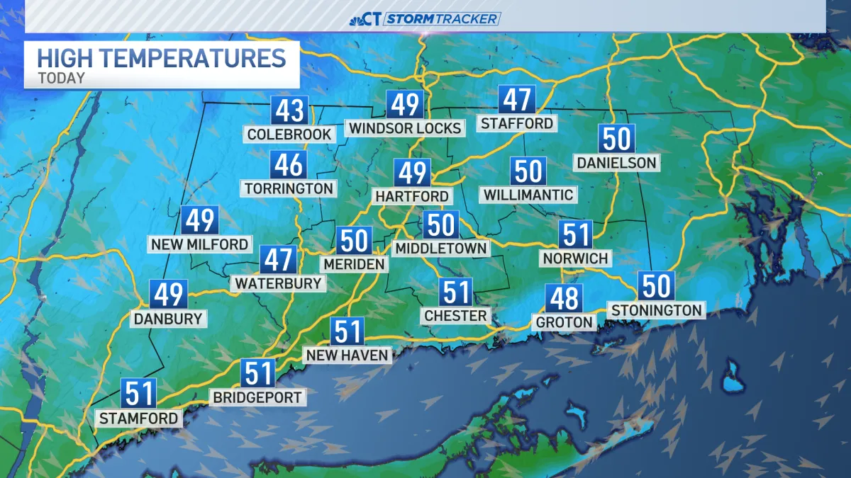 Today’s sky cover will be mostly cloudy, plus there will be a slight breeze at times, all of which will make it feel quite chilly across the state. Temperatures will top out between 45-50 degrees today.