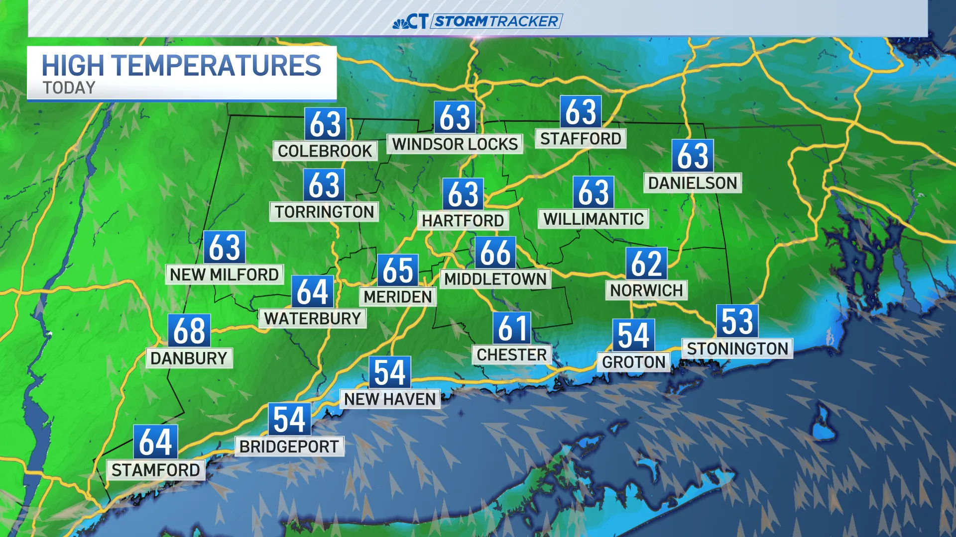 High temperatures today are in the 60s inland and much cooler at the shoreline.