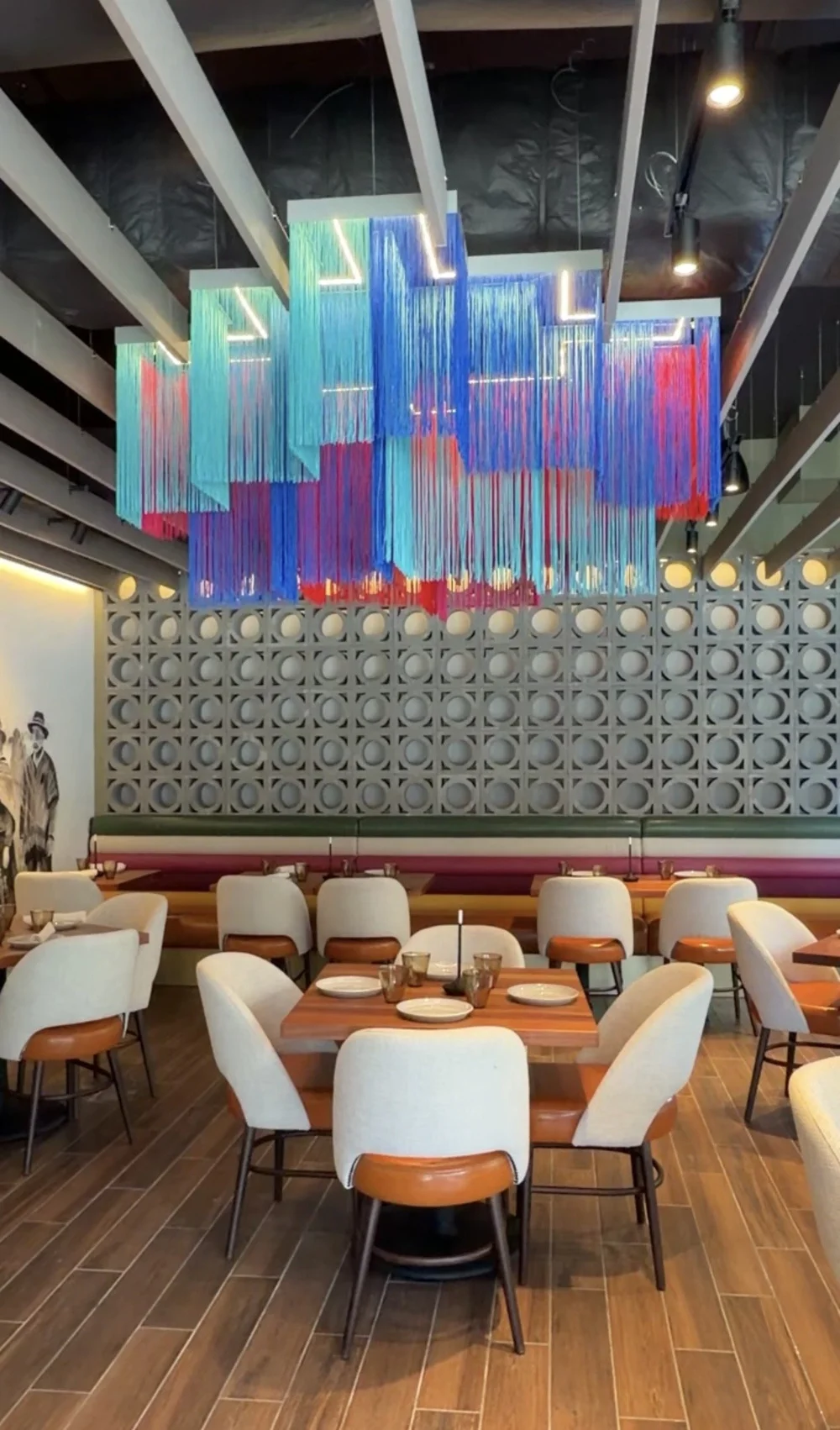 Macrame wall dividers and pendant chandeliers represent Peru’s Andes mountain range and a nod to Peru’s macrame artistry. Another colorful pendant chandelier takes the form of the Inca Cross, the Chakana, and represents the Andean Cosmos with its array of colors. Grecia Ludena said Arkay-Leliever even created a textured effect on the walls that evokes images of old buildings in the town of Coracora, with peeling paint.