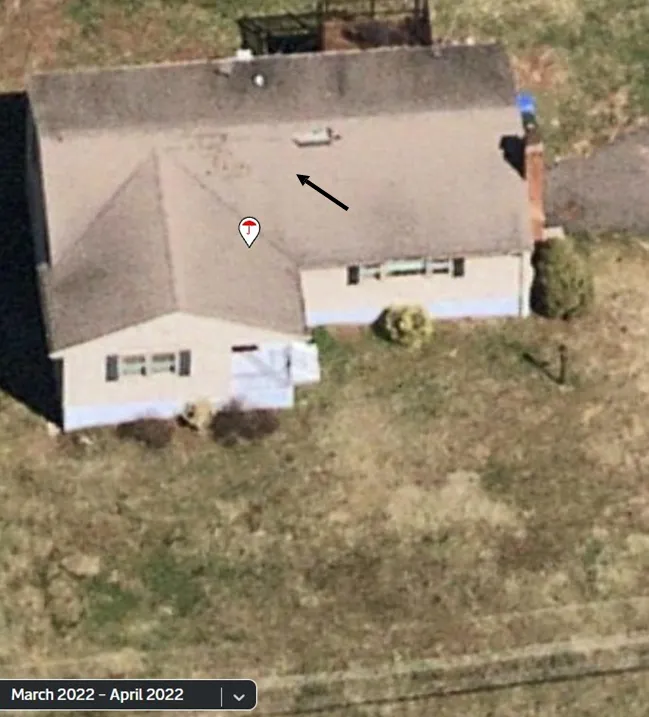 A denial letter sent to the family stated that the roof showed signs of wear and tear and deterioration and that the missing shingles at the front of the house dated back to 2022- three years prior to the October storm. As part of the claim denial, Travelers provided an aerial image from a company called Nearmap, dated March 2022-April 2022.