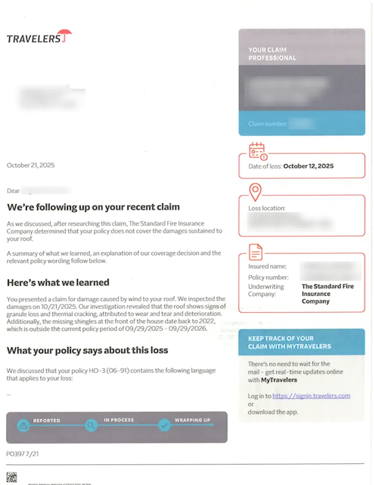 Travelers said when the claim was first filed, it sent an adjuster to evaluate the damage in person and said they found “thermal cracking and granule loss,” which Travelers said indicates wear and tear as the root cause.