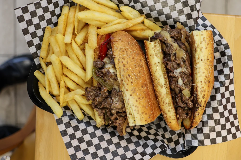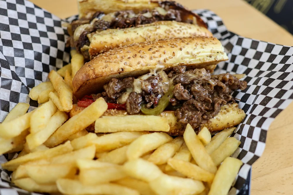 Cheesesteaks, made with freshly shaved ribeye, have been a hit here. Each is served with onions and peppers on a locally made, soft, sesame seeded semolina roll.