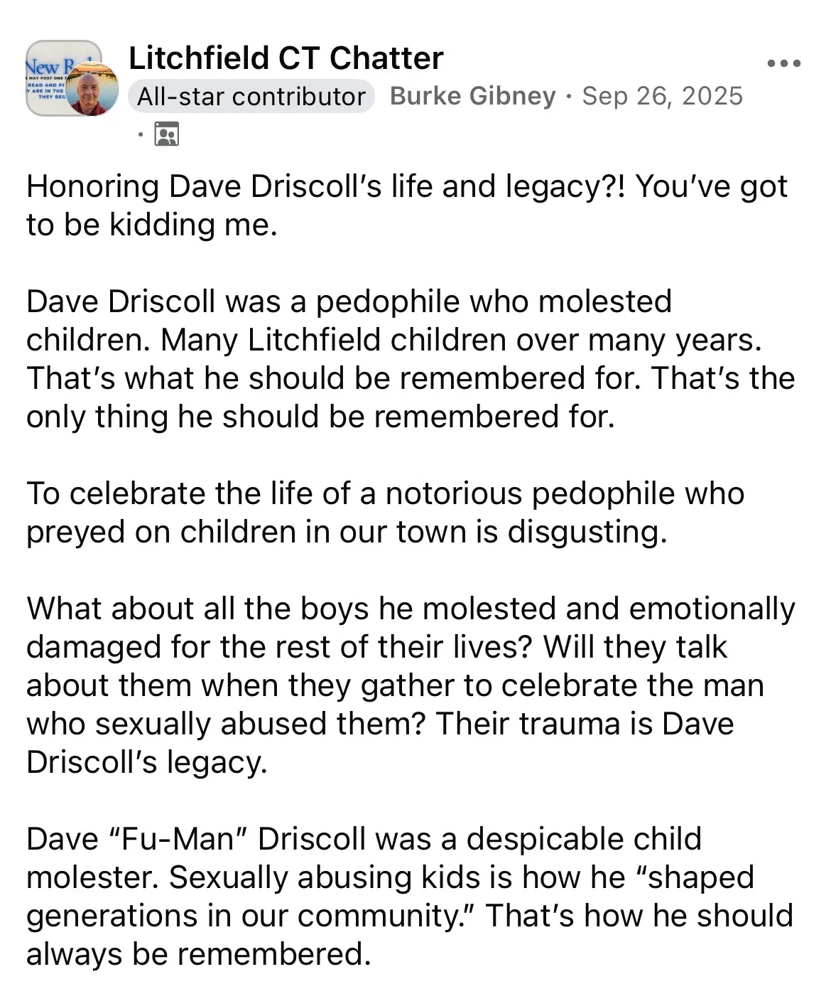 Another man who had Driscoll as a coach, Burke Gibney, posted publicly, alleging Driscoll had sexually abused children on the track team. Gibney, too, has alleged that he was a victim.