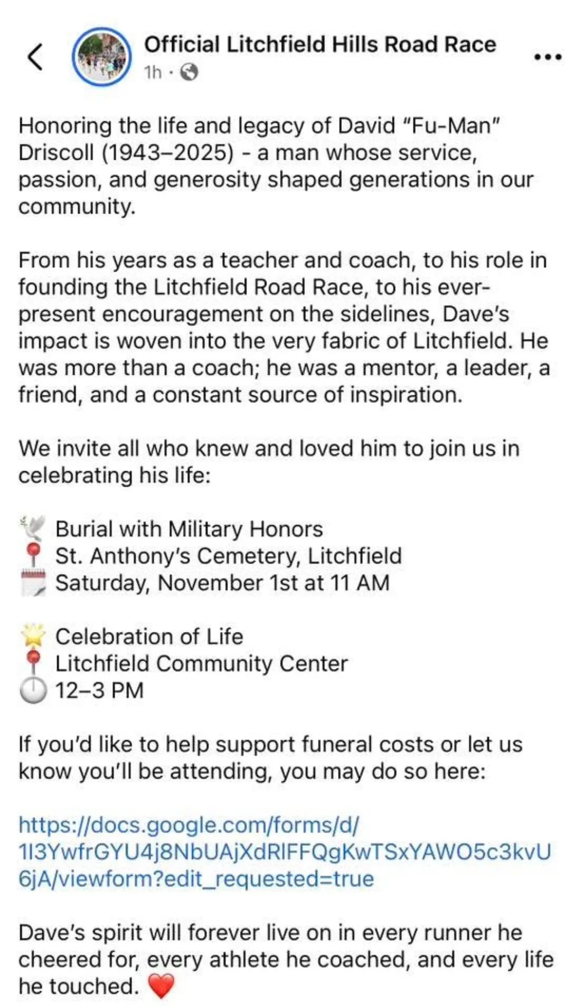 Until September 2025, when Driscoll died after a short battle with cancer. The community began planning a celebration of life.