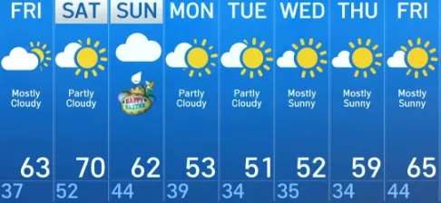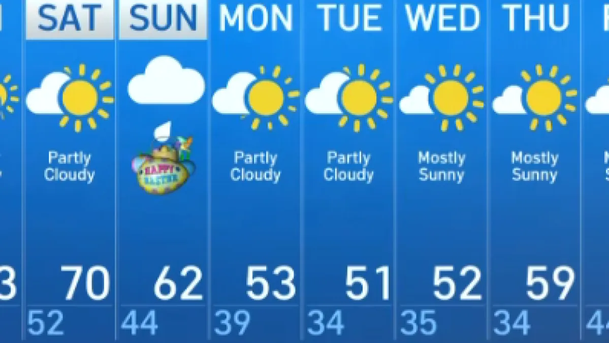 Tomorrow brings partly sunny skies with a slight chance for an isolated shower. Temperatures will be milder, topping out around 70 degrees.