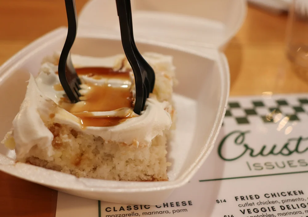 “No one’s coming to your table and it’s not gonna be some 22-year-old girl screaming, ‘WELCOME TO CRUST ISSUES!!! Can I get you some water?!’” he says. “That’s never gonna happen. No one’s asking you if you want coffee or dessert after. But you’re gonna have an excellent restaurant food quality meal. I’m still serving entrées on paper plates and you still gotta walk up to the counter to order. We’re not chasing certain things like needing a fish dish on the menu or saying we need new salads. I don’t give a fuck about that. It’s a collection of dishes that are satisfying, comforting, delicious, tasty, whatever you want to say. And there’s pizza involved, and bagels now, and for some reason we have tres leches cake. There’s no one else you’re gonna interact with except the people who are cooking your food. Everyone wants to open a neighborhood spot, we just weren’t capable of executing it, but now we’re that much closer to doing so. You wanna be happy? Have a good meal? Come here. Try a cutlet, a mozz stick with scarp sauce, and the new pizza.”