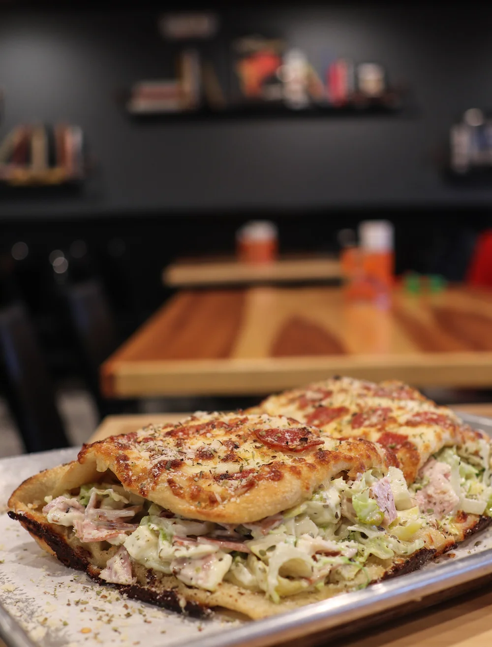 Maybe it’s the chopped Italian combo, stuffed between “bread” that’s folded over pizza dough with cheese, herbs, and pepperoni baked into the top of the “bun.”