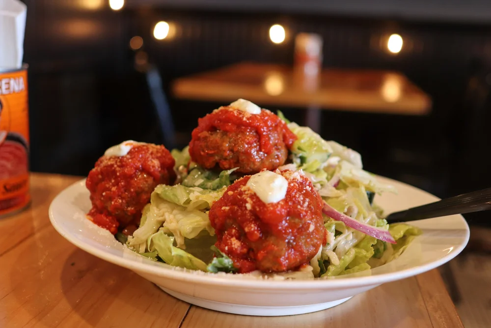 Perhaps it’s for a house salad but with three big, saucy, marinara covered meatballs on top.