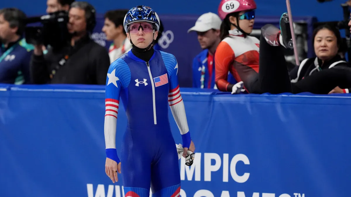 Fairfield’s Kristen Santos-Griswold’s semifinal race was cut short after she fell and her blade appeared to hit another skater’s face.
