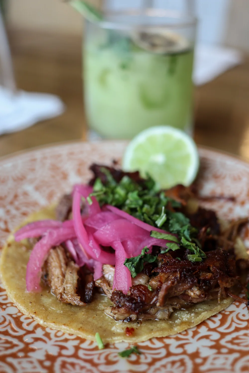 Tacos are undoubtedly a big deal here and they fly out of Masa’s kitchen all day and night and at happy hour. Pictured: Carnitas w/pickled red onions and jardin (cilantro)