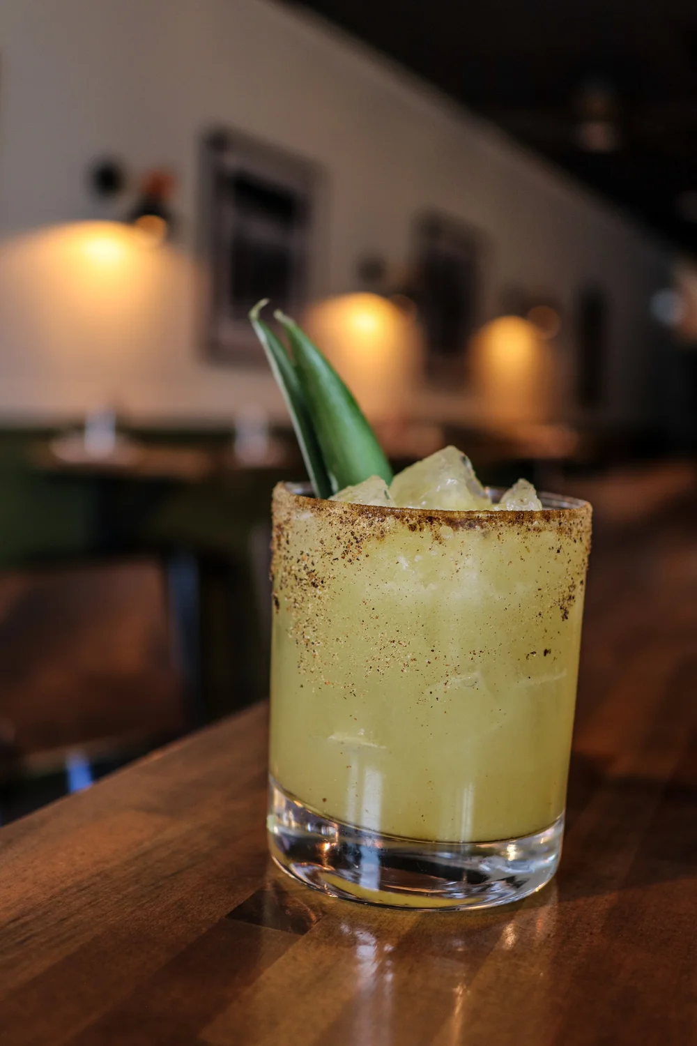 The bar is heavy on tequila and mezcal cocktails, beer, and some wine. Pictured is the Smokey Pina w/Los Siete Misterios Mezcal, chile liqueur, lemon, pineapple, agave syrup, and house-made dried chile salt.