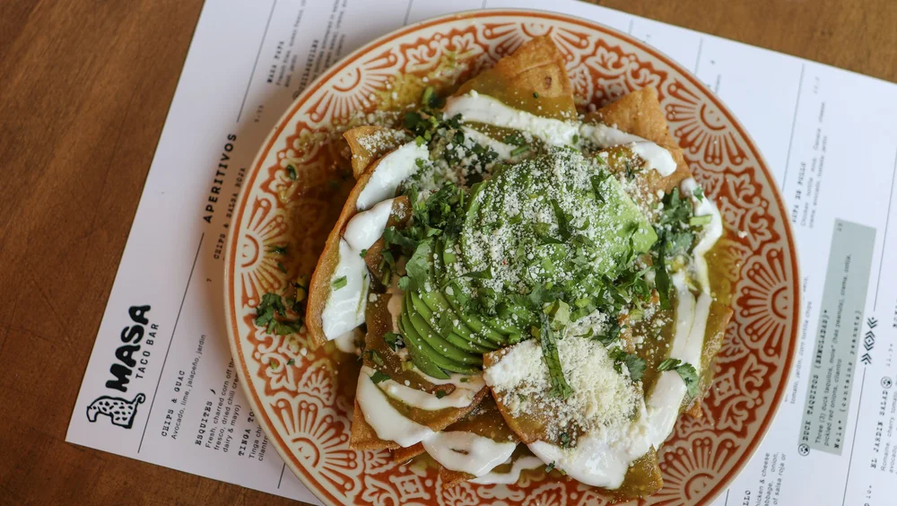 At Masa, apps range from a few tostadas, to maduros and esquites, and chips with salsa or guac, or these chilaquiles, chips simmered in salsa verde (or red, if you want), with crema, avocado, cilantro, and queso fresco.