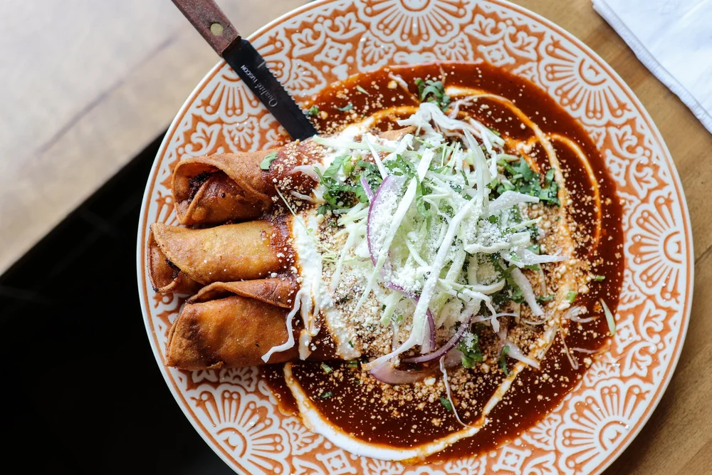 Flautas de pollo – shredded chicken and cheese taquitos, crema, cabbage, onion, cilantro, cotija, and salsa roja