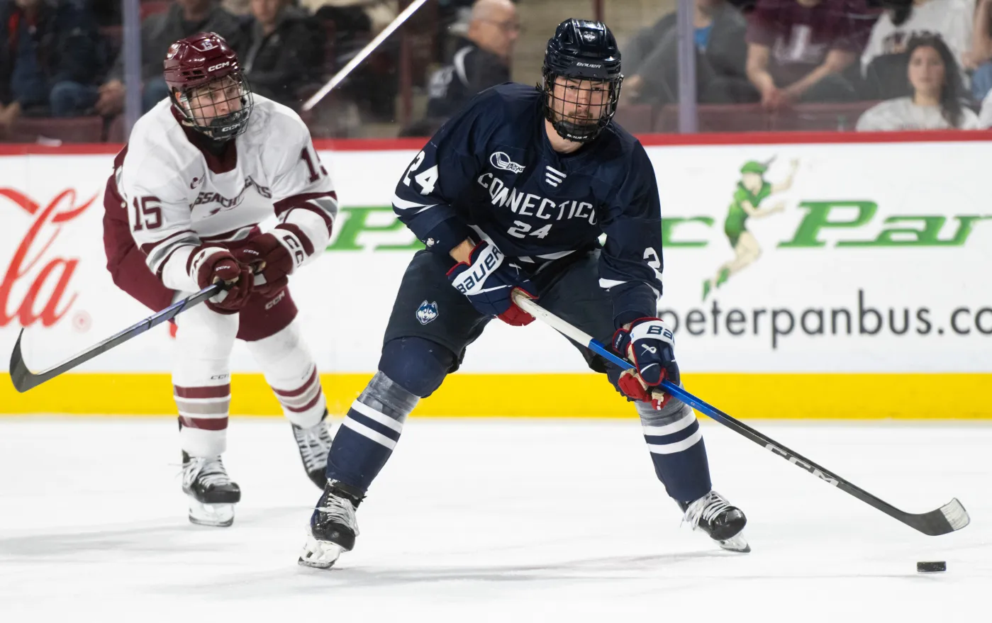 If you haven’t seen it, the Huskies were tied with UMass in overtime last Saturday. After UMass was stopped by goalie Tyler Muszelik, UConn had possession and began a rush. Defensemen Kai Janviriya brought the puck across center ice and a quality scoring opportunity seemed to be developing.