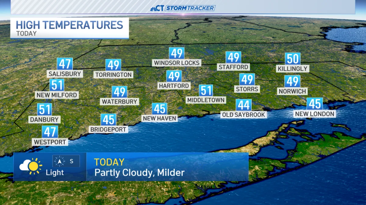 The fog and clouds dissipate and skies are partly to mostly sunny with milder temperatures in the upper 40s.