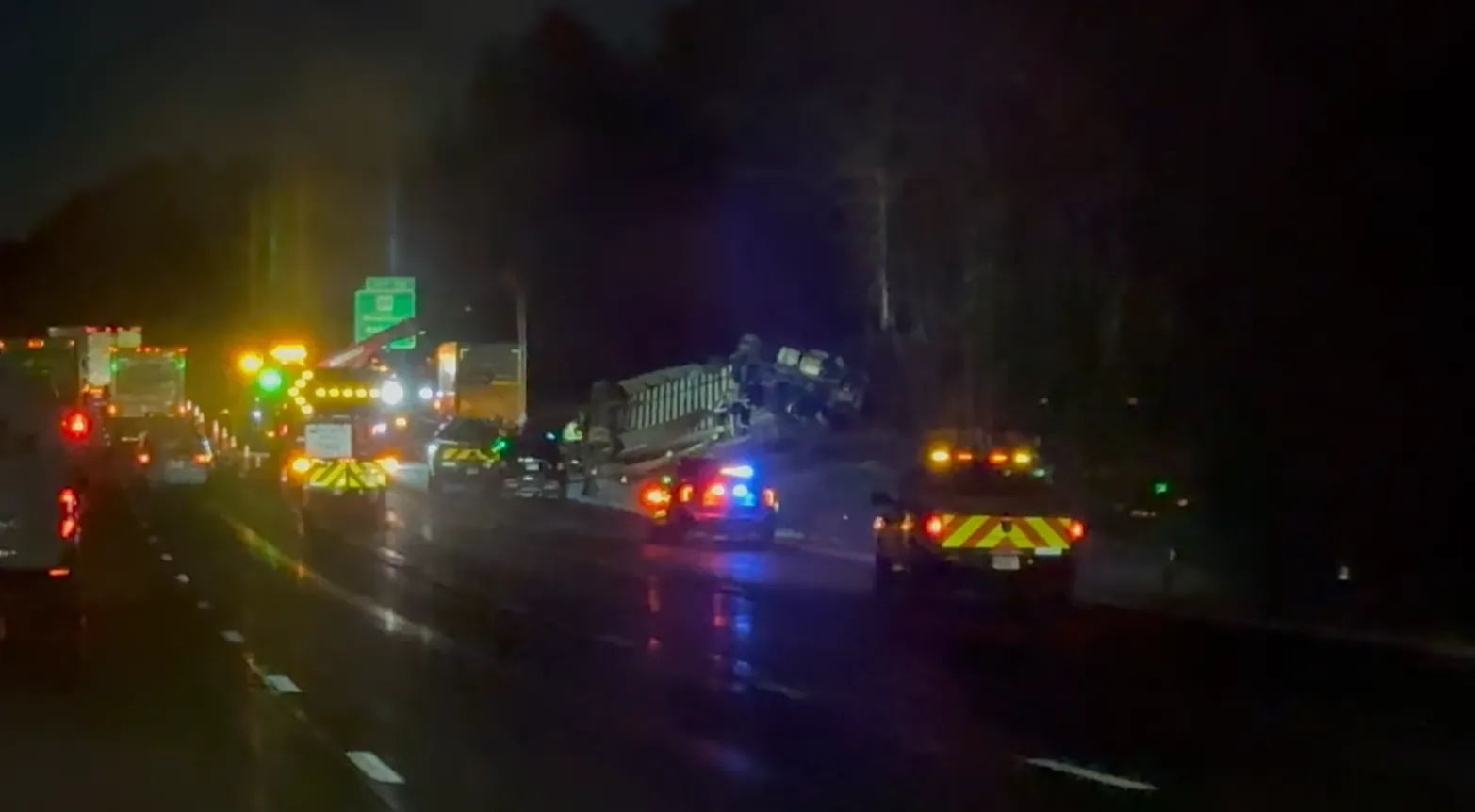 A double tractor-trailer crashed and completely overturned onto its back just before midnight on Monday, and the right lane was closed until around 9 a.m. Tuesday.