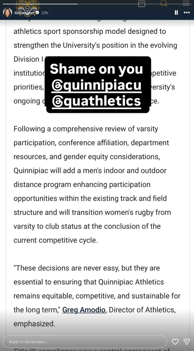 “Shame on you @quinnipiacu @quathletics,” Maher wrote on her Instagram story.