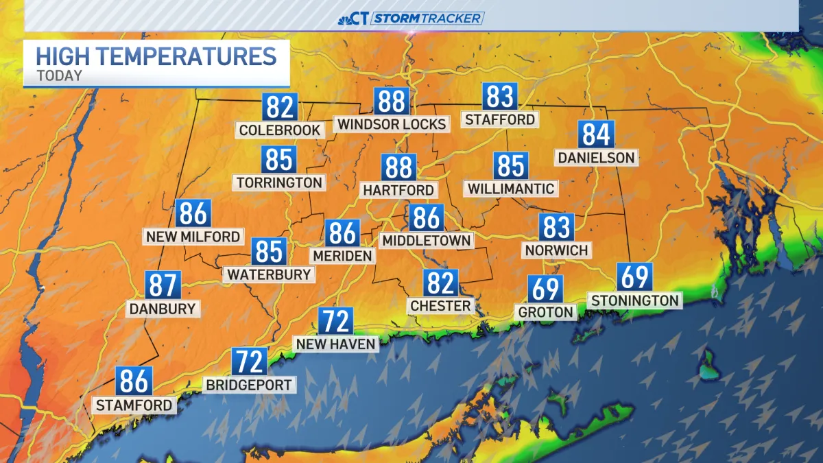 High temperatures today will be in the low to mid 80s inland and in the 70s near the shoreline.