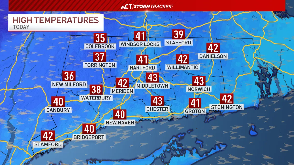 It will be partly sunny by this afternoon. Highs are in the lower 40s, though it may feel like the 30s due to the wind.