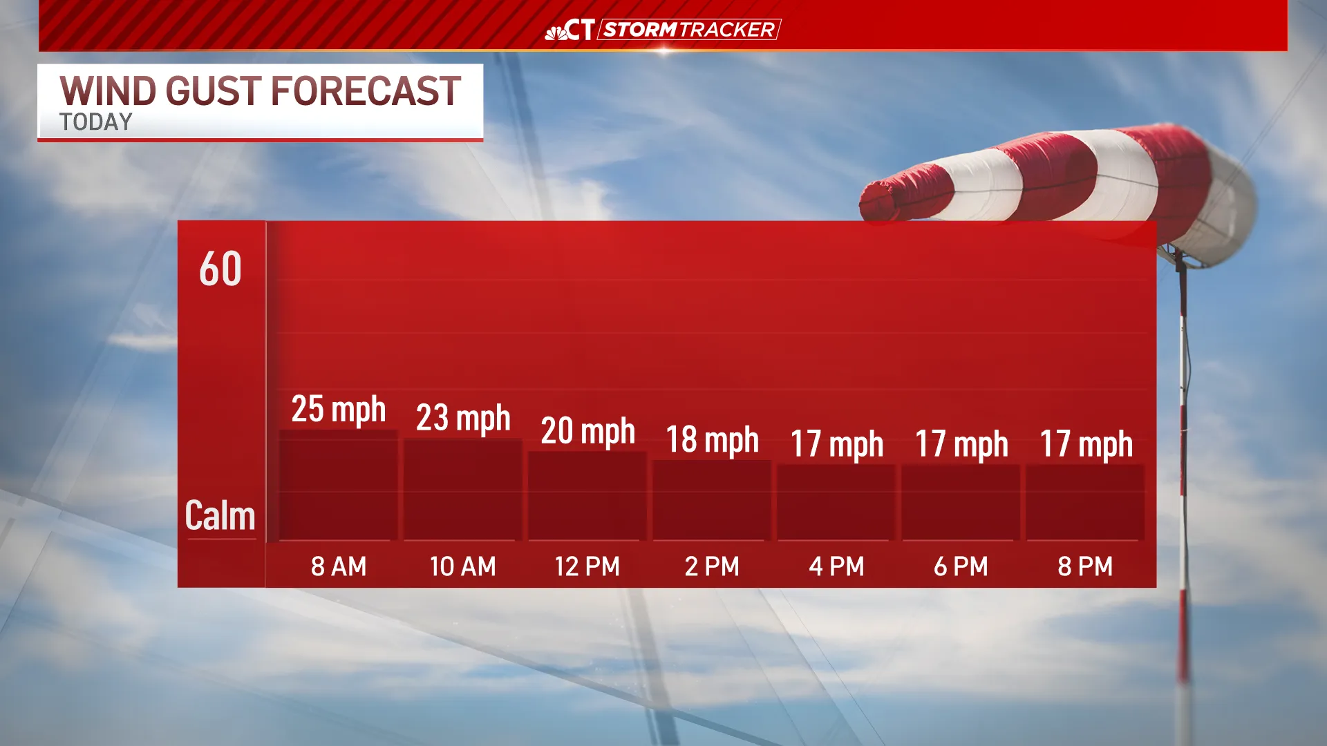 The highest wind gusts on Tuesday will be about 25 miles per hour — a big difference from the last 24 hours, where gusts as high as 60 mph were felt.