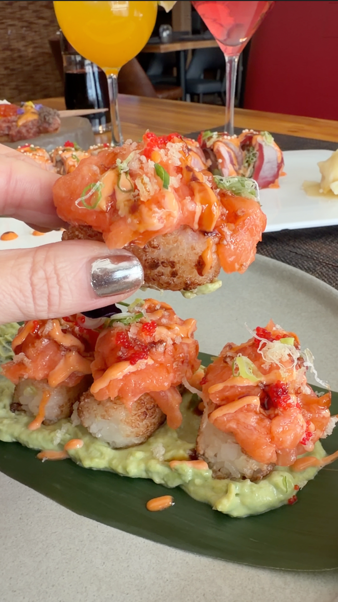 Before I finished, I couldn’t resist turning to the la carte three-piece Crispy Rice, a study in texture: creamy avocado holding up a gently crisp rectangle of rice, crowned with tender, melt-in-your-mouth salmon. It was truly delightful (so much so that I saved the third and final piece for my last bite of the meal), as was the Toro Toast, with its rainbow of rich tuna, truffle mushrooms, and sun-yellow crunchy Japanese oshiko or pickles.